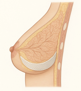 Bei Brustvergrößerungen kommt – abhängig von der Gewebebeschaffenheit und der Implantatgröße – häufig die resorbierbare Galaflex™-Membran zum Einsatz. Diese dient als innerer BH, der das Implantat stabil in Position hält und langfristig für ein volles Dekolleté sorgt.